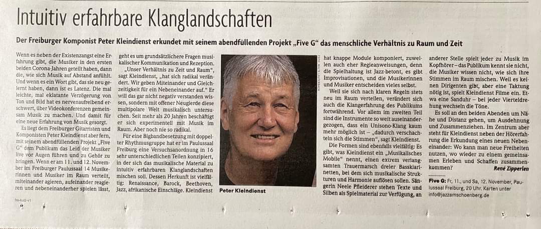 Die für Five G ausgewählten Musiker kommen aus dem Jazz, haben aber auch Erfahrung mit freier Improvisation und Neuer Musik. Die Musiker proben im Vorfeld einer